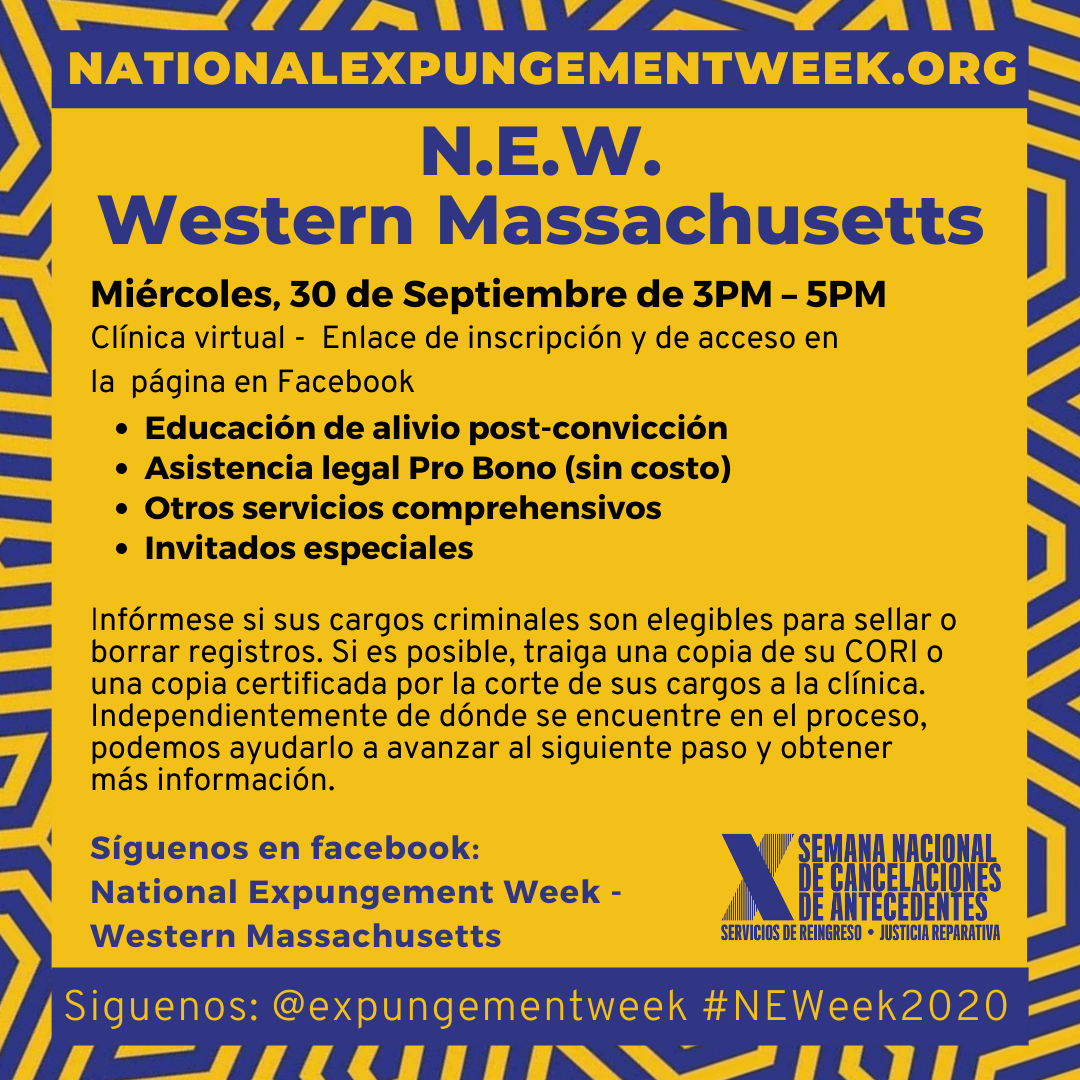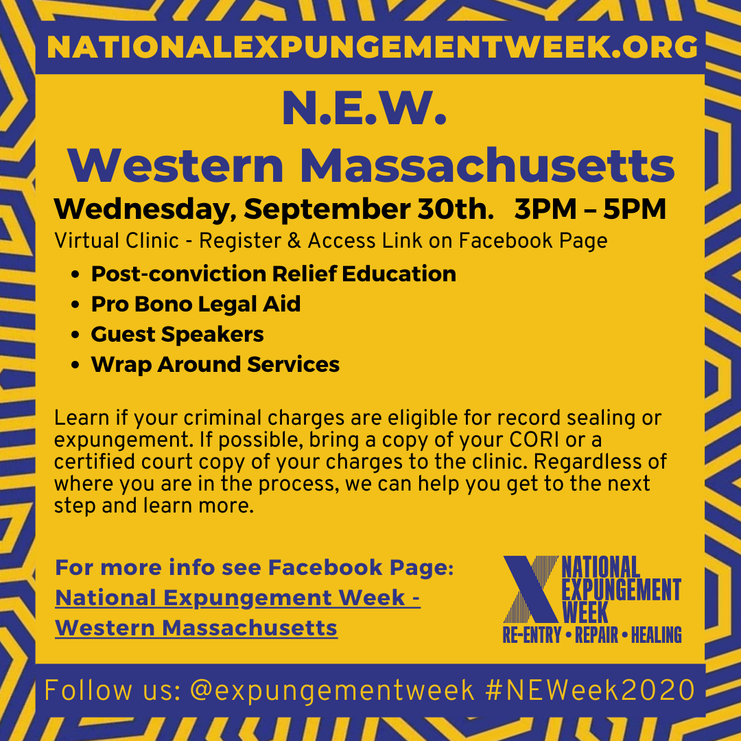More information is available on the Western Mass website at: https://www.facebook.com/events/virtual-zoom/national-expungement-week-western-massachusetts-virtual-clinic/1264915813871715/.