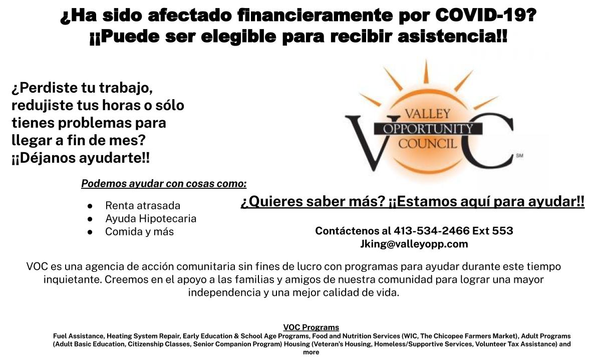 Valley Opportunity Council (VOC) announced new resources are available for rental and mortgage assistance for those impacted by COVID. In addition to offering this resource, case managers will connect households to other VOC supports (fuel assistance, specific job training, child care, etc.) and community supports.  Please help spread the word and share the attached flyers (currently in English and Spanish) with your networks and households.  Hampden County households are eligible.